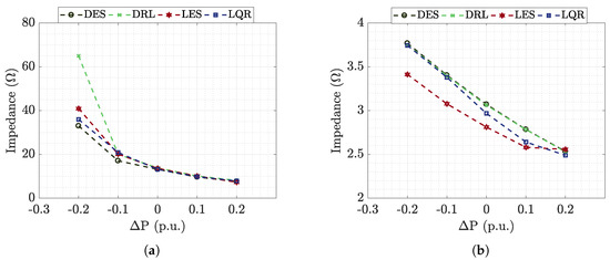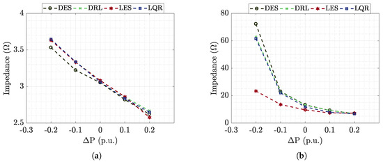 For the input impedance of the CPL buck during the simulation depicted in Figure 23a, the DRL and LES methodologies are observed with the highest impedance value for negative variations. For positive variations, all methodologies present similar impedance decreasing. In test environment, whose results are presented in Figure 23b, the LES controller exhibits the lowest impedance for the p.u. variation while the methodologies with output feedback structure have the highest output impedance value. All methodologies have similar impedance.