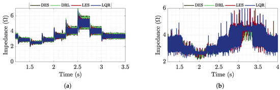 All methodologies exhibit similar output impedance for the CPL boost in the simulation. During the test, the DES and DRL methodologies presented an impedance value slightly lower than the other methodologies. The output impedance of the feeder connected to CPL boost is shown in Figure 30a during the simulation, where it is observed that all methodologies presented similar mean impedance. During the test (cf. presented in Figure 30b) the DRL methodology presents a lower level for each variation. Notice that the CPL input impedance for each instant of variation is less than the impedance of the CPL buck presented in the previous section, as well as the output impedance of the feeder. The lower impedance is reflected in the minor loop gain calculated for the boost converter and shown in Table 6.
