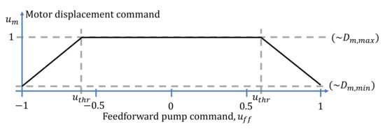 The relative reduction of the motors’ displacement between the maximum and a dynamically set minimum (load dependent) is referred to as (Equation (2)). If , it implies that the motors’ displacement is reduced to its minimum allowable displacement, . The factor, , is controlled by the feedforward command, , which is based on the vessel movement, actual displacement, and the exit diameter of the wire on the drum. The threshold-value, , defines at what point the motors’ displacement should start to be reduced.