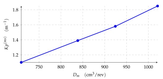 By the parameter-variation and use of the Routh-Hurwitz criterion on the transfer function , the for a marginally stable system was found, . The added motor control is implemented as a pure feedforward, hence stability is not affected as long as the internal displacement controller of the motors are stable (which is assumed in this case). Therefore, the motors’ natural frequency and damping ratio, and , have no effect on the system stability. As seen in Figure 4, the new controller could lead to situations with lower displacement settings than the classic controller. Based on parameters from Table 2, Figure 5 shows the relationship between and motor displacement.