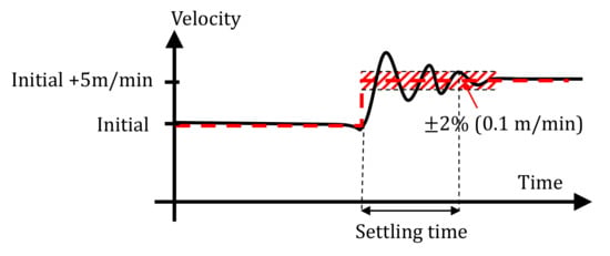 Due to the increased motor’s displacement at low speed, the winch is expected to run smoother and give lower settling times. The settling time is tested by setting a fixed wire velocity reference and then step up the reference velocity by 5 m/min. The settling time is defined as the amount of time between the step command and the instant where the velocity is settled close to the target value within a certain tolerance. In this case, this tolerance is 2% of the step size (i.e., 0.1 m/min) as reported in Figure 9.