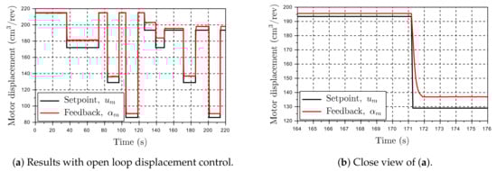 The downside of the OL control is represented by the hysteresis and offset between desired and actual displacement. The offset is not critical since all the motors have a displacement feedback sensor. It introduces some challenges when the system is trying to reach its full capacity, i.e., maximum pumps’ and minimum motors’ displacement. If the motors have not reached the desired displacement, the maximum speed capacity is reduced. It is, however, not seen as critical for the planned tests that the system is not be able to reach its maximum capacity, and it is of little consequence in the evaluation of the new control method. During the test shown in Figure 13b, the motor was standing still and with an idle pressure of 25 bar on the A and B port. The displacement controller was running on a fixed pilot pressure of 150 bar to ensure good controllability. This scenario is representative of the motors operating under normal conditions. It is seen that the displacement has an offset of approximately 5–10% and a noticeable hysteresis.