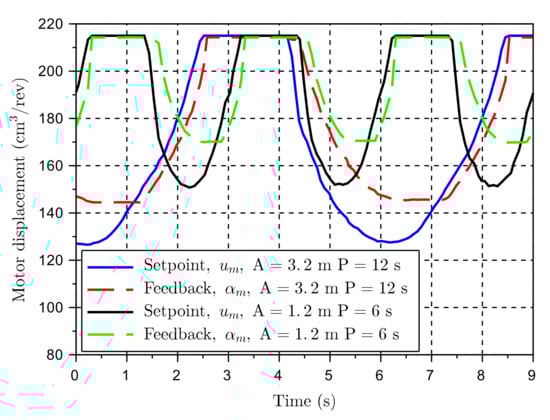 Several tests were conducted to ensure that the motors can change displacement fast enough to track the commanded setting. The motors are generally reacting faster when the CL is used, so the OL control was chosen being the most conservative way to evaluate the new control method. The results with the OL were satisfactory since sufficient displacement variation was achieved in less than one second (Figure 13b). For comparison in a worst-case scenario, the AHC may have to react to a sinusoidal wave with a peak velocity of 110 m/min and the winch working on the outermost layer. If is set to 0.6, there will be a duration of 1.1 s from when the variable motor control is active to the point of maximum velocity. Therefore, the response time of approximately 1 s is considered more than adequate.