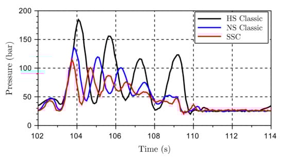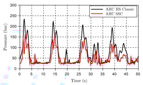 The results from scenario 3 are in line with the previous ones and confirm that the AHC SSC has obvious advantages concerning controllability in the form of reduced oscillations for most conceivable working scenarios. The pressure levels are lowered (Figure 25), and the control error (Figure 26) is minimized.
