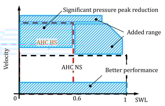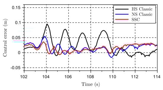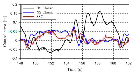 The velocities are so high that the high speed (HS) mode would be the chosen option from a lift planner perspective. Comparing the proposed method (i.e., the AHC SSC) to the HS mode, the pressure peaks are now reduced by more than 120 bar (Figure 20), that is a significant achievement. Additionally, the control error remains within 10 cm compared to more than 20 cm for the HS mode (Figure 21). The normal speed mode is also performing adequately, but with higher pressures than the AHC SSC. When addressing the classic normal speed (NS), it is worth mentioning that this mode reaches its full capacity, while the AHC SSC still has 10% pump capacity left in addition to a potential motors’ displacement reduction of more than 20% (see Figure 22).
