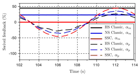 The classic system’s control uses a conservative fixed value of the motors’ displacement to be able to cope with the required operation, winch stiction, and winch acceleration. The resulting torque peaks when the winch is switching direction (i.e., scenarios with low speed and high acceleration). The new controller is expected to improve the performance compared to the classical controller. One of the main reasons is that the motors are set to maximum displacement whenever the winch is passing zero velocity. This decision will ensure a higher system stiffness and high torque capacity. As a result, lower amplification of the system resonance and smaller pressure peaks are achieved. Considering that the feedforward signal is the most significant part of the pumps’ command signal, it is clear from Figure 3 that the motors’ displacement will be at the maximum value when the pump is passing zero displacement.