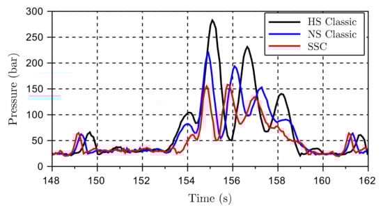 Maximum peak pressure during test sequence: (a) Classic; (b) SSC.