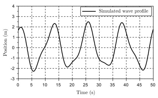 The purpose of this modification was exploring the systems’ performance under a scenario closer to a real-life operation. Typically, the vessel has at least two dominant frequency components. One frequency for large swells, often related to the pitch of the vessel, and another one with a bit smaller amplitude but higher frequency. The second frequency is, in many cases, related to the vessel roll. In this case, it was simulated as a 0.5 m amplitude with a 6 s period time on top of a 2 m amplitude with a 13 s period time.