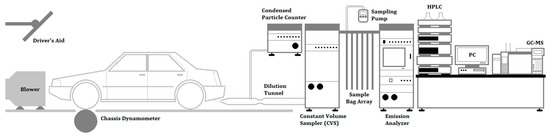Figure 1 depicts the chassis-level vehicle emissions measurement system of this study. As illustrated, the test system mainly comprises a 110 kW, electrical chassis dynamometer (ONO SOKKI PECD 9400, Yokohama, Japan), a constant volume sampling (CVS) system (HORIBA CVS-7400, Osaka, Japan) combined with a multi-component emission analyzer (HORIBA MEXA-7200H, Osaka, Japan) and a condensed particle counter (CPC, HORIBA MEXA-1000SPCS, Osaka, Japan) for the measurement of gaseous emissions and particle number. Gas chromatography combined with flame ionization detector (GC/FID, AGILENT 6890N, Santa Clara, USA) and high-performance liquid chromatography (HPLC, AGILENT 1200 series, Santa Clara, USA) quantified the unburned methanol and formaldehyde emissions in the exhaust. Table 1 tabulated the main specifications of the test instruments.