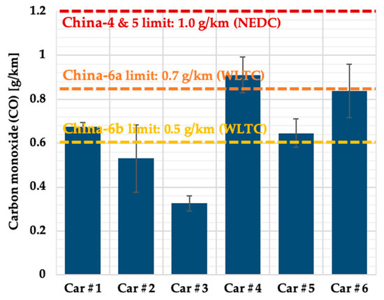 The regulatory limits of China-6a and China-6b are also given in Figure 2. Four of the six test vehicles could meet the requirement of China-6a, but only one vehicle managed to meet China-6b. Since China-6 is WLTC-based, which means a more aggressive driving style than the NEDC and, therefore, a stiffer challenge for CO compliance, substantial improvements in the combustion and after-treatment systems design are needed to meet future regulations.
