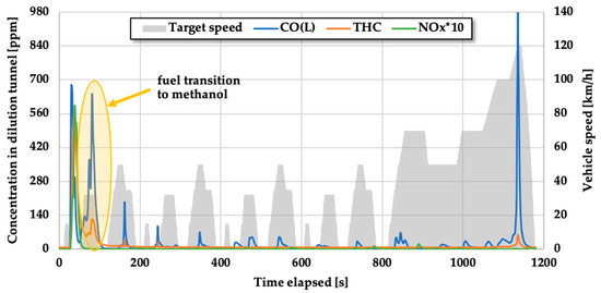 It can be seen in Figure 3 that apart from the NOx spike noticed in the first 70 s after the start of testing, there are only a few small spikes afterward. In theory, the formation of NO is a function of the availability of oxygen, in-cylinder temperature, and residual time. Since the engines of the test vehicles ran in a stoichiometric manner, an essential reason for the well-controlled NOx emissions is the relatively low in-cylinder temperature, which is a consequence of methanol’s lower adiabatic flame temperature and higher latent heat of evaporation.