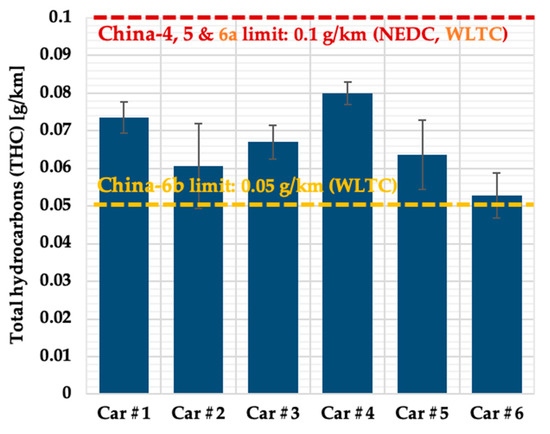 Figure 4 depicts the THC emissions from each test vehicle. The THC emissions from the six test vehicles were relatively close. The largest inter-car variation of 33.8% was between Car#4 and Car#6. Similar to CO, the highest THC emission, which was 0.0799 g/km, came from Car#4, the vehicle with the highest mileage in the test fleet. There was no clear tendency between the mileages and THC emissions among the rest of the test vehicles. According to Figure 4, the THC emissions from all the six test vehicles were below the limit value of China-4 of 0.1 g/km, suggesting good in-service conformity. On average, the THC emissions from these dedicated methanol taxis were 0.066 ± 0.010 g/km, about one third lower than the limit of China-4. However, a comparison to the China-6b limit of 0.05 g/km THC highlights the challenge for the future application of methanol vehicles. It can be estimated that regardless of the difference in drive cycles, a minimum reduction of 40% in THC is mandatory for type-approval.