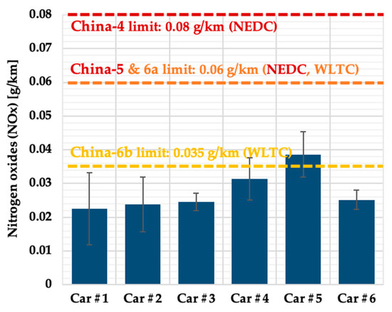 For each vehicle, the emission tests were performed with three repeats. The standard deviations of the results were calculated following Equation (1) and illustrated in Figure 2 and Figures 4–8. In Figure 9, the error bars denote the standard deviations among the six test vehicles regarding each pollutant, which were also calculated according to Equation (1).