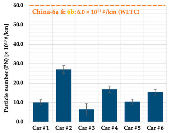 Figure 6 depicts the PN emissions from the six dedicated methanol taxis measured using a PMP-compliant, certification-level condensed particle counter (CPC), which only counted the solid particles with diameters ranging from 23 nm to 2.5 µm.