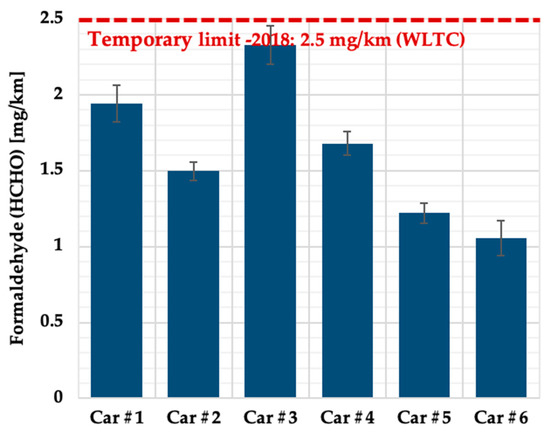 The unburned methanol emissions from the six field-aged, dedicated methanol taxis are plotted in Figure 8. It can be seen that the unburned methanol emissions from Car#1 to Car#5, which ranged from 3.81 to 7.16 mg/km, were all below 10 mg/km but above 2.5 mg/km, which are the provisional limits for unburned methanol emission from light-duty methanol vehicles set by the MIIT of China in 2010 and 2018, respectively. However, the unburned methanol emission from Car#6 was 51.22 mg/km, more than six times greater than the rest. Nevertheless, it is interesting to notice that the least formaldehyde also came from Car#6, this tendency agreed well with the trade-off correlation between unburned methanol and formaldehyde emissions observed by Gong et al. [11].