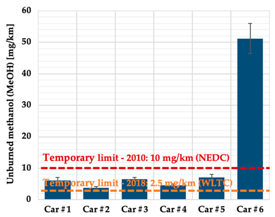 In Figure 3, THC emissions detected over the NEDC are typically contributed by the incomplete oxidation of fuel within the engine-start event and warm-up period. Additionally, engine misfire could be another crucial source of extra THC [2]. However, we have to be cautious about the artifact caused by the FID principle, which quantifies THC emissions by oxidizing hydrocarbons into carbon ions and counting them. Thus, an FID cannot identify the existence of oxygen in molecules, resulting in an underestimation of THC mass. This is particularly true for methanol vehicles because oxygenated hydrocarbons are much more abundant in the exhaust, underlying the discrepancy between THC and unburned methanol emissions. This issue will be carefully discussed in the section of unburned methanol emissions using Car#6 being an example.