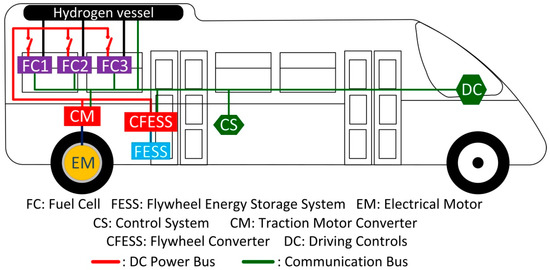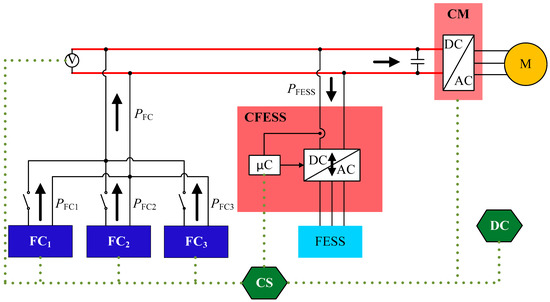 The traction motor and the FESSs are connected to the DC power bus (continuous red line) by means of converters (CM and CFESS) to manage the power flows as required by the master control system (CS) via the communication bus (green line).
