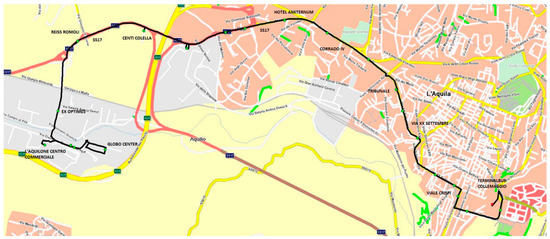 Input data defining the simulation (data about vehicle, drive cycle, and path topography) were experimentally acquired on an electric bus operating in real traffic conditions over a urban bus line in the city of L’Aquila in Italy (Line 2 of the city’s transport network—a roundtrip tour of about 17 km length), shown in Figure 4. Table 1 illustrates the main data of the selected roundtrip cycle; the path is fully in an urban context, with a speed limit of 50 km/h.