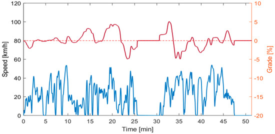 Figure 5 shows the vehicle cycle in terms of speed and grade vs. mission time. Data were obtained by both a GPS acquisition device installed on board and the processing of the main operating parameters measured by vehicle ECU (through vehicle CAN communication protocol).
