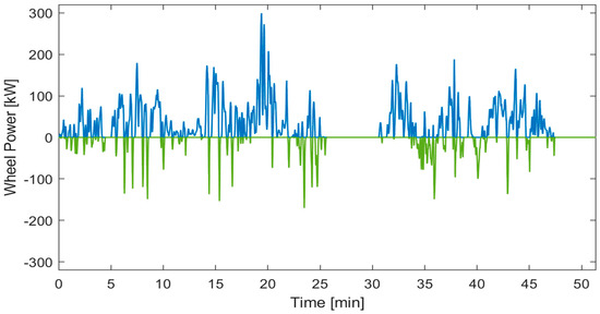 Given that the speed profile and the path characteristics are imposed and all the quantities in the right side of Equation (3) are known, the traction thrust T(v(t)) and the power at vehicle wheels T(v(t))v(t) (Figure 6) can be computed. Then the electrical traction power Pu(t) is calculated by Equation (8), and the HPU can be sized.