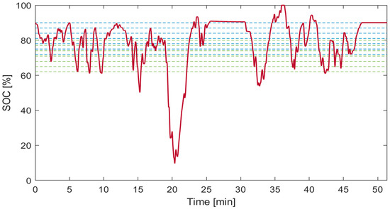 The control strategy of the HPU was based on the knowledge of the FESS state of charge (SOC) as the controlled variable. In particular, as it is shown in Figure 7, seven SOC activation levels were defined to increase the FC power output (step 1/7 of the overall power) when crossed with negative slope (green dashed lines) and the other seven levels (blue dashed lines) were used to decrease the FC power if crossed with positive slope, on a “relays-based” approach, which can be realized for practical automotive applications.