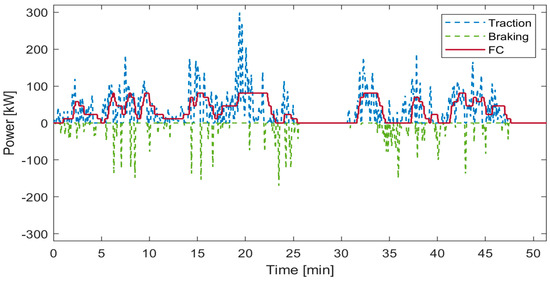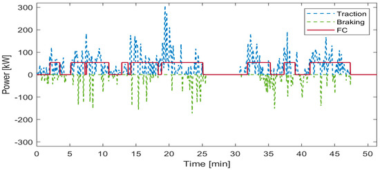Figure 13. Electric power profiles: traction (blue), regenerative braking (green), and FC (red).