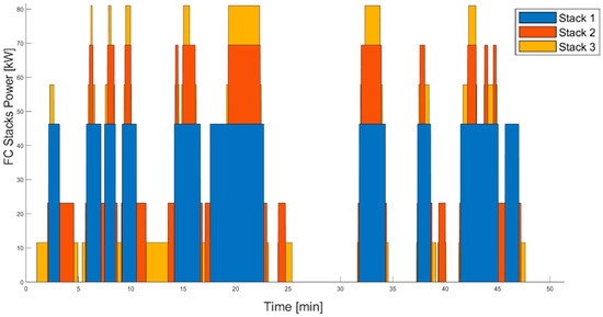 The FC power output demand had to be produced through the independent activation of the three installed stacks, as above described. Figure 10 reports a graphical representation of the partitioning of the FC stack and of the independent activation of the three stacks.