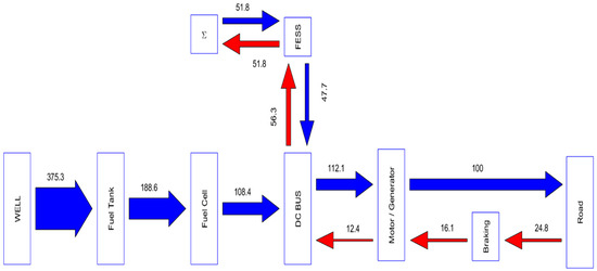 Lastly, Figure 11 reports a Sankey-type diagram of the overall energy fluxes among the various components of the power unit. All data represented are the result of the complete dynamic simulation of the vehicle on the given mission; all vehicle variables were calculated vs. time with a time resolution of 0.1 s and then integrated vs. time to obtain overall energy fluxes between the components. The Sankey diagrams are automatically sketched by the SW tool.