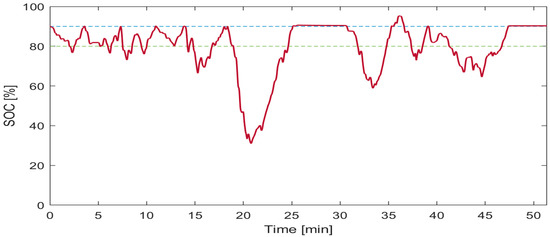 The FESS SOC profile is also reported in Figure 8; it shows that the FESS is well dimensioned in terms of its storable energy amount, with its SOC oscillating between 50% and 90% most of the time. There is only a small critical time interval in which it gets as low as almost 10%, and the FESS saturates (100%) in a negligible time interval.