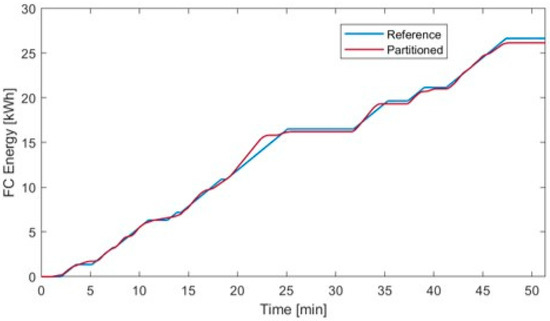 Figure 15. FC output energy: Comparison between FC partitioned in three stacks, and benchmark single stack case.