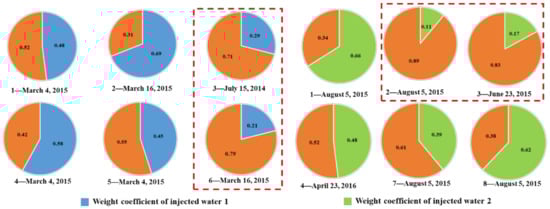 The comprehensive scores of produced water (), formation water (), injected water 1 (), and injected water 2 () were substituted into Equations (11) and (12).The proportions of the injected and formation water in the produced water of each well before and after 28 May 2015 could be calculated. The results are shown in Table 7 and Table 8.