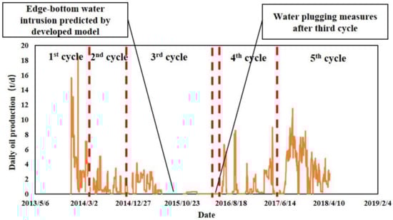 As shown in Figure 4 and Figure 5, in the first cycle of the CSS, well 2 had good development effects with high daily oil production and low water cut. However, with the increase of circulation cycles, the daily oil production of well 2 decreased significantly. By the end of the third cycle, the water cut of well 2 reached 100%. The production performance of well 2 indicates that this well has severe water production and needs corresponding treatment urgently. Since the oil field development is in the early stage, researchers are not familiar with the block, and the corresponding tracer interpretation data is lacking. Therefore, it is difficult to propose corresponding effective treatment measures according to the source of the produced water in well 2. On 5 August 2015, block M applied the model established to well 2 for discriminating the source of produced water and found that the edge-bottom water intrusion in well 2 was severe. Consequently, well 2 was set as a test well, and water plugging measures were taken for this well in July 2016. After water plugging, the daily oil production of well 2 increased significantly, and the water cut declined. The measures for plugging the edge-bottom water in well 2 have shown good results.