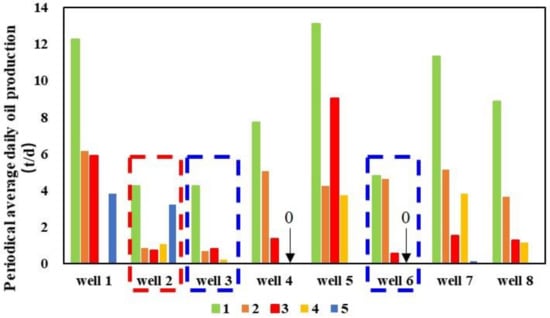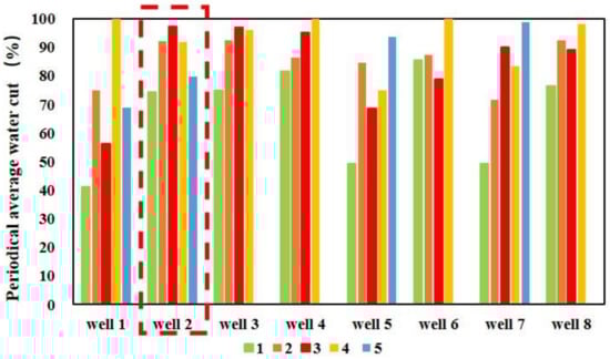 As shown in Figure 6 and Figure 7, most of the typical CSS wells in block M have undergone 4–5 cycles. As mentioned above, the water cut in well 2 increased and production decreased rapidly in the early stage because of the serious edge-bottom water intrusion. After water plugging, the periodical average water cut decreased and the periodical average daily oil production was restored. With the increase of circulation cycles, the water cut of all the wells, except for well 2, rose in a fluctuating manner. Even the water cut of well 4 and well 6 rose to 100% in the fourth cycle. Correspondingly, as shown in Figure 7, with the increase in circulation turns, the periodical daily oil production of the CSS wells, except for well 2, showed a clear downward trend. Among them, well 3, well 4, well 6, and well 7 were in a serious condition, even the fourth periodical average daily oil production of well 4 and well 6 was reduced to 0. Therefore, corresponding treatment measures are needed for these wells urgently. According to the analysis results of the model developed, the weight coefficients of formation water in well 3 and well 6 are large, which indicates formation water intrusion is serious in these wells, and the water plugging measures should be implemented correspondingly. For well 4 and well 7, the weight coefficients of the formation water are relatively small. Consequently, in these wells, the main problem is the ineffective circulation of the injected steam in the high permeability layer. In this situation, profile control measures should be taken to reduce the permeability of the highly permeable layer.