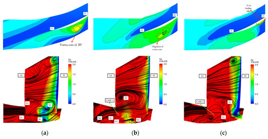 In Figure 9b, the hub radial vortex interacts with the leakage flow generated by the clearance gap. The high momentum fluid produced by the leakage flow makes the radial vortex move towards the trailing edge. The radial vortex core moves from 0.5 chords to about 0.7 chords. At the same time, the radial vortex is unstable under the impact of leakage flow. After a part of the fluid is flushed to the trailing edge, two spiral points N 3 and N 4 connected by saddle point S 1 are formed at the trailing edge because of the lesser energy of the leakage flow. This is a closed separation formed by the typical saddle point spiral point, which has the nature of confinement. It can be seen from the entropy contour that the static entropy concentration region i.e., vortex core moves backward in comparison with the baseline flow field. However, the newly generated closed separation results in the expansion of the high entropy region and the increase of the root loss. At the same time, the clearance leakage is divided into two parts under the action of the radial vortex. One part is sucked by the unstable radial vortex system (N 1, N 3, N 4). The other part is thrown into the boundary layer of the suction surface of the blade under the rotating action of the vortex. It can be seen from the limit streamline of suction surface that the scale of concentrated shedding vortex on the suction surface is larger in comparison with the prototype because of the inflow of partial leakage flow. The radial scale of the concentrated vortex developed from 0.3 H to 0.5 H. Although the scale increases but the strength of the vortex weakens. It shows that the static pressure coefficient of the corner increases and the low-pressure area of the baseline decreases, which indicates the impact of the clearance leakage making the vortex into an unstable state.