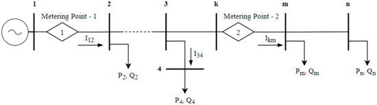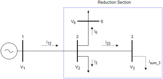 It is important to observe that the values of current and voltage at substation (node 1) are measured and known, so it is possible to estimate the voltage at bus 2, according to Equation (20). Regarding values of the branch currents, must be mentioned that not all sections of the system have a measurement, however, the branch and node currents calculated in the backward sweep step are used as pseudo-measurements. This way, the current between buses 2 and 3, in the analysis of reduction section 1, is considered as equal to the summation of currents downstream and may be calculated according to Equation (25).