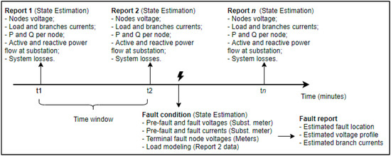 The use of the state estimation method for fault location in distribution networks has been the focus of recent studies [4,5,6,7,8,9]. These techniques can be classified according to location, quantity, and technology of the available monitoring infrastructure [10]. The method proposed by Gord et al. [9] estimates the fault location based on a comparison between the stored current and voltages measured at the beginning of the feeder with the corresponding values obtained by simulating short circuits at different points of a distribution system. Moreover, the work determines the faulted section by calculating an index developed by analyzing the frequency components. Dashti and Sadeh [11] propose a method based on impedance using dynamic load estimation and a distributed parameter line model. As has been previously reported, dynamic load estimation contributes to increased accuracy in the region under fault. Moreover, Vieira et al. [12] presented a new method for detecting and locating high impedance faults (HIF) in primary networks using unbalanced voltage measurements collected from smart meters (SMs), which were installed in low voltage end customers. Li et al. [13] proposes a program for analyzing faults in distribution systems in association with pattern recognition methods, database searches, and phasors obtained from the feeder root node. A non-linear state estimator based on power summation was proposed by Almeida et al. [14]. In this work, the authors estimate only one phase of the system, using the single-phase equivalent to determine the state of the other phases.