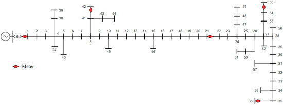 The fact that the measured currents are used to determine the factor of load unbalance does not necessarily mean that the estimated voltages at nodes will be balanced, considering that in the Forward Sweep process, each phase will estimate the node voltages according to the previously pseudo-measured currents estimated, which will be unbalanced if the measured currents are unbalanced, according to Equation (16). If there is a voltage imbalance in the meters installed along the feeder, there will be no limitation of the algorithm in this regard, considering that the measured voltage data will always be taken as reference nodes in the reduction section under analysis, as shown in the Section 5.2.