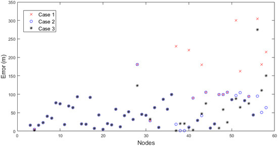 The largest location errors were observed in the nodes that do not contain measurement, while the smallest errors were found in the nodes closest to meters. The reduction of errors (ε) at buses located on lateral branches without measurement can be obtained by installing meters on terminal nodes, as observed in Case 3.