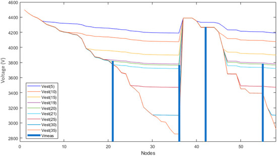 As example, a phase-to-ground short circuit occurring at bus 20, phase A, with a fault resistance of 10 Ω was tested, in order to details the algorithm operation. The allocation of meters used is the same as in Case 1. According Section 5.2, there is an estimated voltage profile for each fault situation. Thus, in Figure 8, for a better understanding, line-to-ground faults were simulated on nine different nodes (5, 10, 15, 19, 20, 21, 25, 30, and 35). Note that the average variation between the measured voltages and the estimated voltages, for situation where bus 20 is the supposed bus under fault, is the smallest among those analyzed, then, the locator defines that bus 20 is the closest bus to the point under fault through the index calculated by Equation (44).