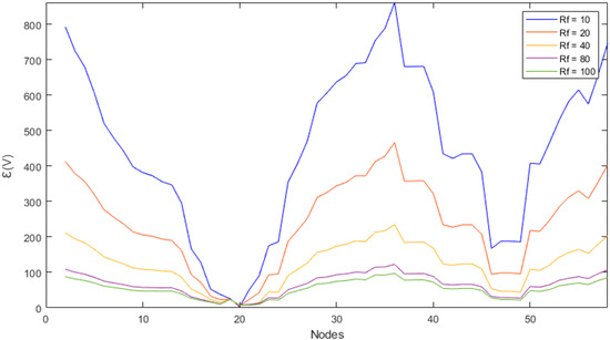 One of the main factors that influence the performance of impedance-based fault location methodologies is the fault resistance [30]. In order to analyze the influence of fault resistance, line-to-ground faults were simulated to all nodes of the system, with fault resistances (Rf) of 10, 20, 40, 80, and 100 Ω. The results obtained are shown in Table 3. Note that in the worst case, more than 80% of the faults were located with errors smaller than 200 m. The biggest errors came from faults with high impedances. The reasons for these larger errors can be explained by absence of meters on terminal branching nodes located in the most distant regions of the feeder root, such as the branching of buses 47, 48, 49, 51, and 58. These errors can be reduced with the installation of new meters in terminal nodes of these branches. Furthermore, it was noted that when the fault resistance increases and the short-circuit current decreases, the voltage variations between the nodes tend to decrease (as observed in curves of Rf = 80 Ω and Rf = 100 Ω of Figure 9), as expected, due to the fact that higher ground resistances tend to cause phase-to-ground faults in a node to behave as low-power single-phase loads, consequently causing small voltage drops. As voltages in the nodes are higher in faults with high impedance, there is a greater contribution of the load currents in these situations, especially in regions more distant from the trunk nodes of the feeder, due to accumulated impedance of cables. Even in these extreme situations, the proposed algorithm proved to be effective in its purpose.