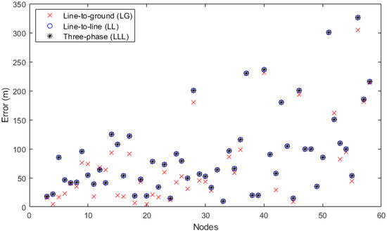 Figure 10 shows the results of the method considering three different types of faults: line-to-ground (LG), line-to-line (LL), and three-phase (LLL). The fault resistance is 10 Ω for line-to-ground faults. All branches of the feeder were considered, not only those belonging to observable region (between two meters).