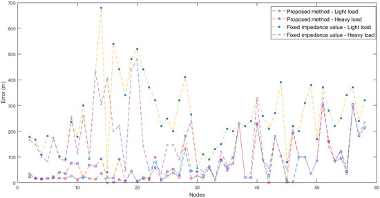 Four cases were analyzed: light load and heavy load simulations, considering the load modeling proposed in this work and comparing it with the load model that considers a fixed impedance value, according to Equation (37). Line-to-ground faults with Rf = 10 Ω were simulated in all cases. It is possible to observe in Figure 11 that the dynamic load modeling based on linear state estimation provides more accurate results when compared to the method that uses a fixed impedance value for the loads, regardless of the system load. The dotted lines between the nodes in Figure 11 were used only to connect their values graphically, to assist in the interpretation of the results, since there is not necessarily a physical connection between the nodes in the same numerical sequence in which they are shown on the x axis.