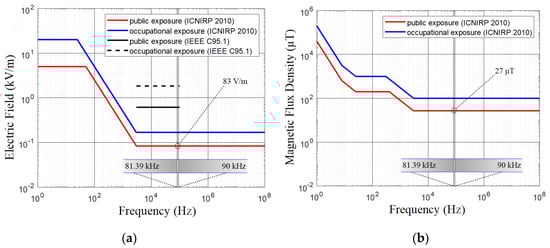 The limiting field level (27 μT) defined by ICNIRP 2010 for public exposure is outlined with the dashed red line. As is obvious, the proposed EM field shielding efficiently suppresses the magnetic field component that could affect the cabin of the vehicle. Its shielding capability will further be improved by assembling it on a vehicle, having a floor fabricated from the metal sheets. Optimization is also possible, either by using thicker ferrites or aluminum plates.