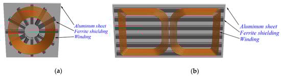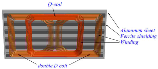 30]. They are usually organized as follows: the windings sit above the ferrite shielding which guides most of the flux under the coil. Then, the aluminum shield is added to the back of the ferrites to protect surrounding objects from any effects of leaked EM field. This is particularly important for EV charging because the vehicle floor is typically made out of steel.