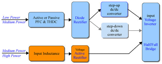 The second proposed configuration has a complex structure, consisting of input active or passive PFC, active or passive total harmonic distortion correction (THDC), a diode rectifier, a dc/dc converter (step-up or step-down) and a voltage source inverter. Such configuration is robust and verified by many similar applications, while the only drawback lies in its higher price and build-in dimensions along with an increase in power rating. This topology should therefore be recommended for low- or medium-power WPT systems.