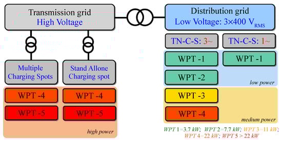 Figure 8 according to system dedicated power level. The secondary side is usually designed according to the type of load and includes either the passive or the active rectifier. Finally, the system connection to the grid considering all the power levels established as WPT categories by SAE TIR J2954 is seen in the conceptual layout shown in