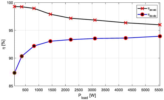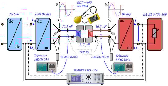 Figure 14) enables us easily to evaluate either the overall system efficiency (25), including the power electronics, or the partial efficiency, corresponding to the power transmitted through the magnetic couplers. The input and the output power were measured with a power analyzer ZIMMER LMG 500, having a declared precision of 0.018% of the scale used for currents and 0.034% of the scale used for voltages.