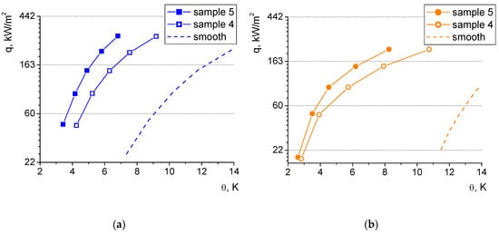 Figure 6a,b represent the boiling curves for samples no 1, 2, 3 and 4 of the same fin width, but different groove width (0.60 mm, 1.15 mm) and different groove depths (0.25 mm, 0.55 mm).