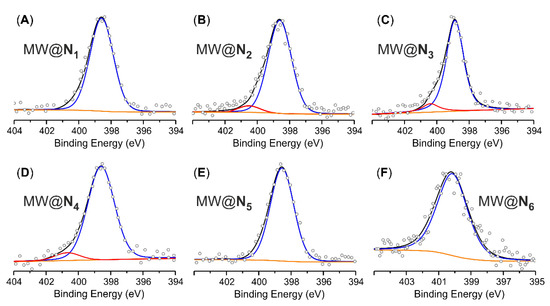 High resolution X-ray photoelectron spectroscopy (XPS) N 1s core level regions for samples MW@N1 (A); MW@N2 (B); MW@N3 (C); MW@N4 (D); MW@N5 (E); MW@N6 (F) along with their respective peak fittings.