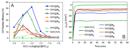 CO2 Electroreduction performance with MW@N1–6 and MWCNTs fabricated as carbon cloth-based electrodes and used in 0.1 M KHCO3 solution as electrolyte. (A) CO faradaic efficiency as a function of the applied potentials. (B) CO current density values (JCO) and their stability vs. time, measured for each electrocatalytic material MW@N1–6 at −1.1 V as potential.